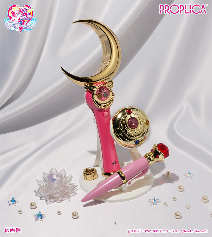 別売りの「PROPLICAムーンスティック」の専用台座と並べて飾ることもできます。 『PROPLICA 変身ブローチ&変装ペンセット』は、本日9月21日(金)13時より、